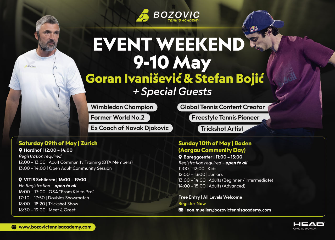 The Bozovic Tennis Academy is proud to announce the BTA Event Weekend 2026, set to take place on May 9–10 across Zurich and the Aargau region. Designed as a premium two-day tennis experience, the event will bring together players, fans, and the wider community through a carefully curated blend of high-performance training, live entertainment, and exclusive on-court access.
